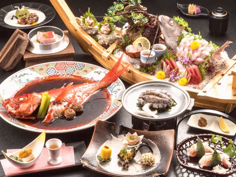 2名様~豪快舟盛付き!!「やっぱり伊豆だね(^_^)/」当館推奨献立です。 《丸ごと煮付け》金目鯛を丸ごと1尾少し濃いめに味付けでお召上がりください。 《にぎり寿司》 当プランご予約の特典として1名様毎2貫。お箸休めにてどうぞ 《金目鯛の釜飯》美... -