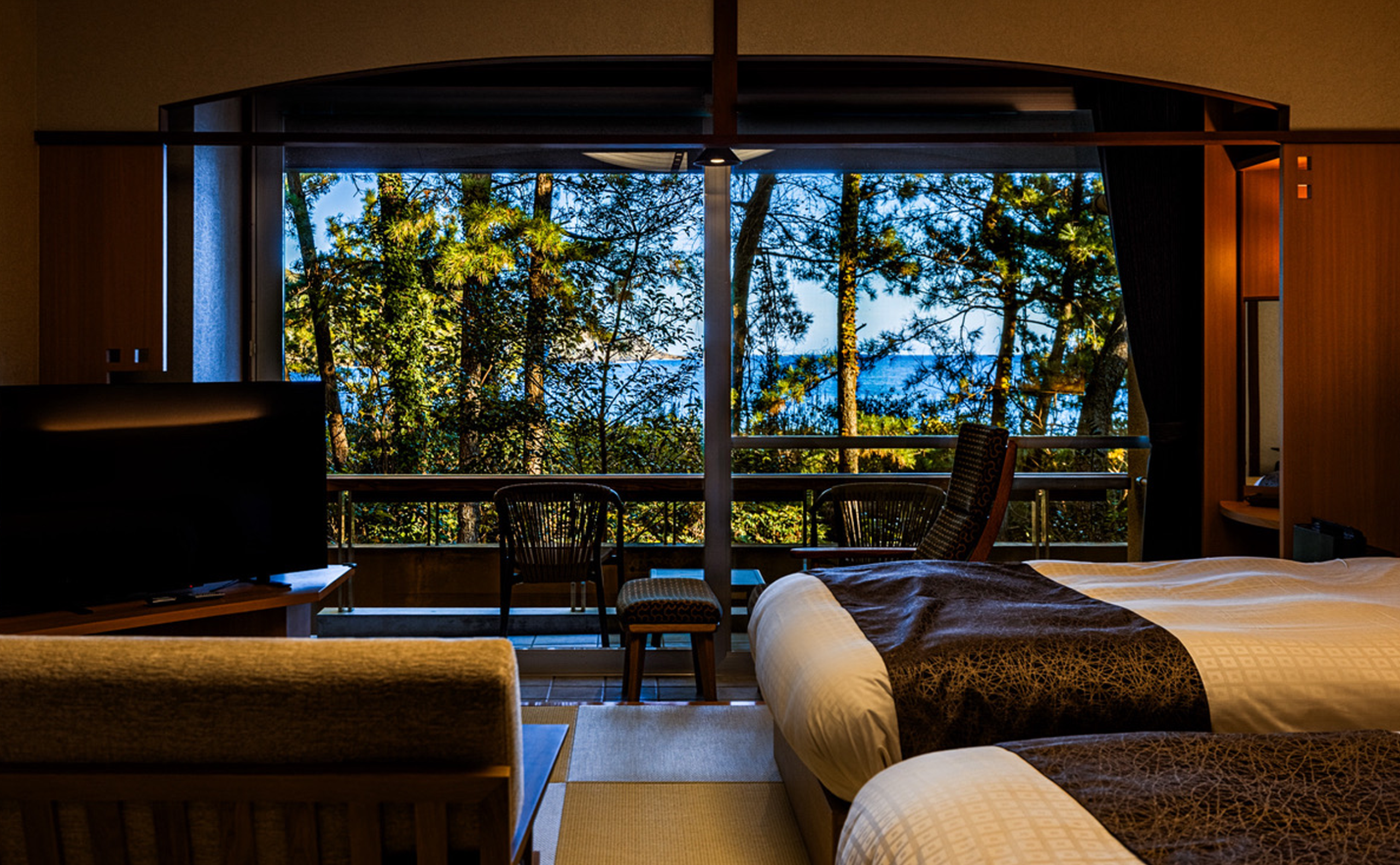 松林越しに海を臨む大きな窓、広いバルコニー。