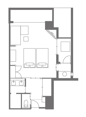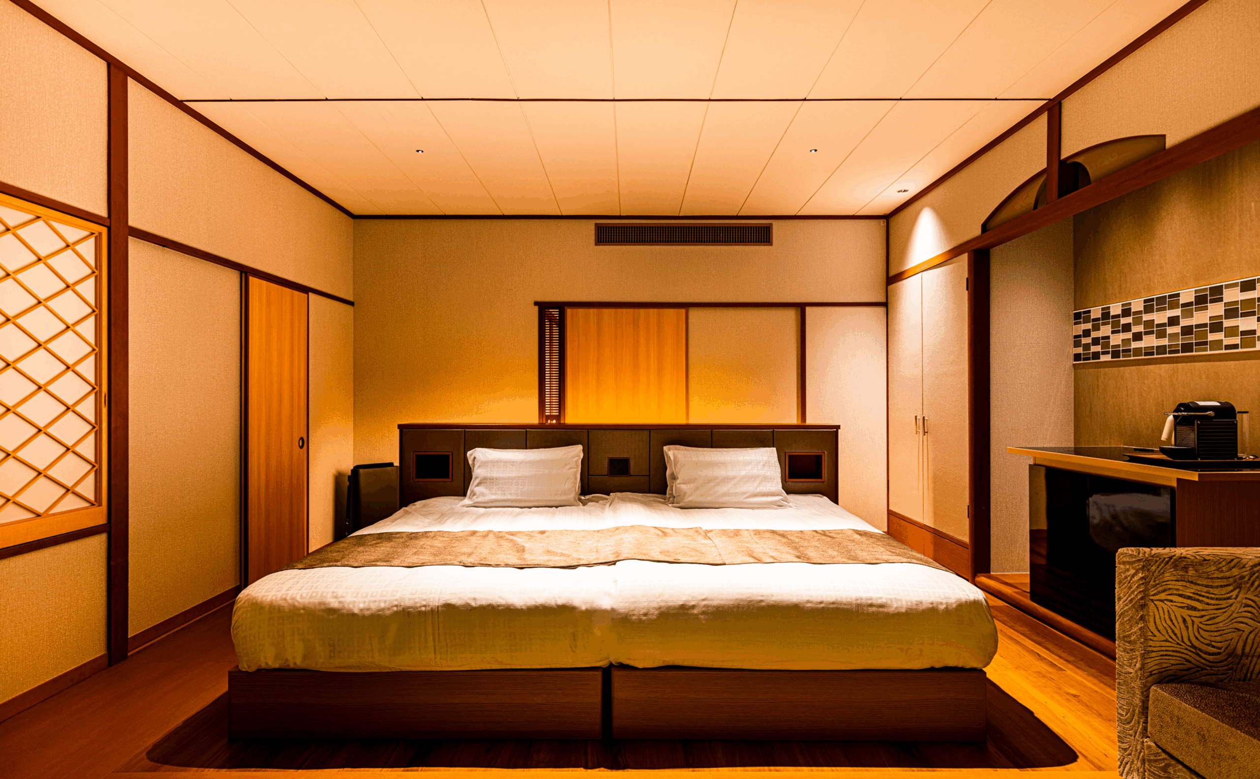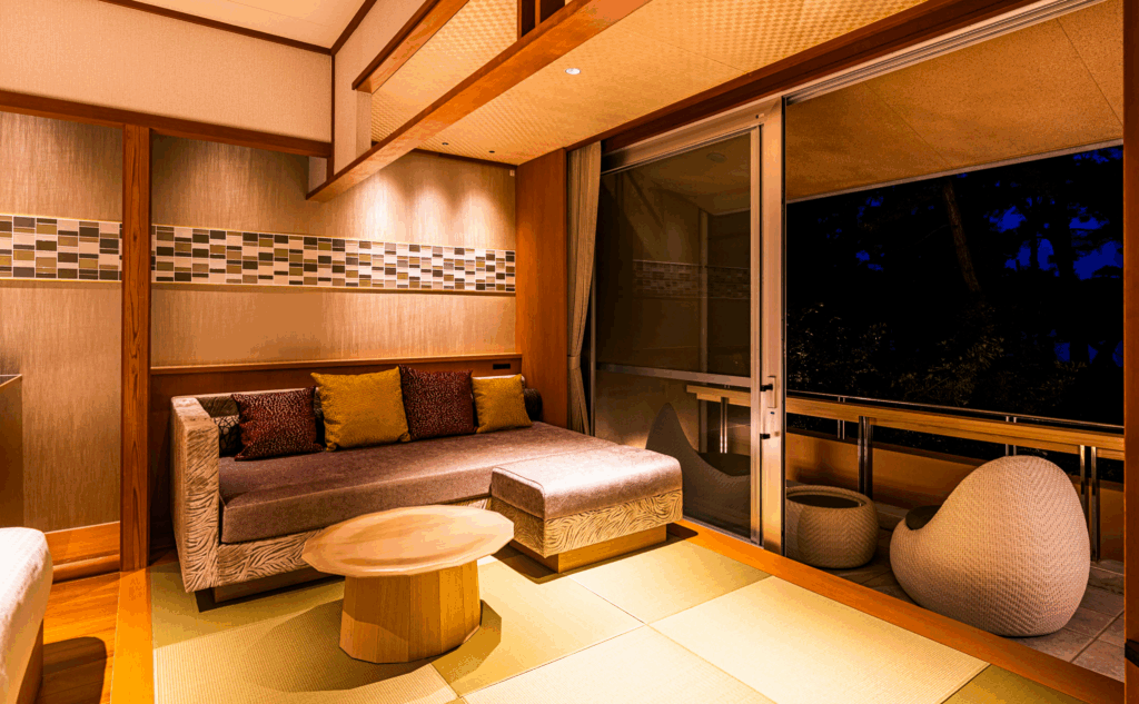 ●ツインベッド(セミダブル)+リビング+シャワーブース+露天風呂+洗浄機能付きトイレ
