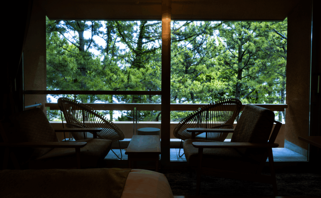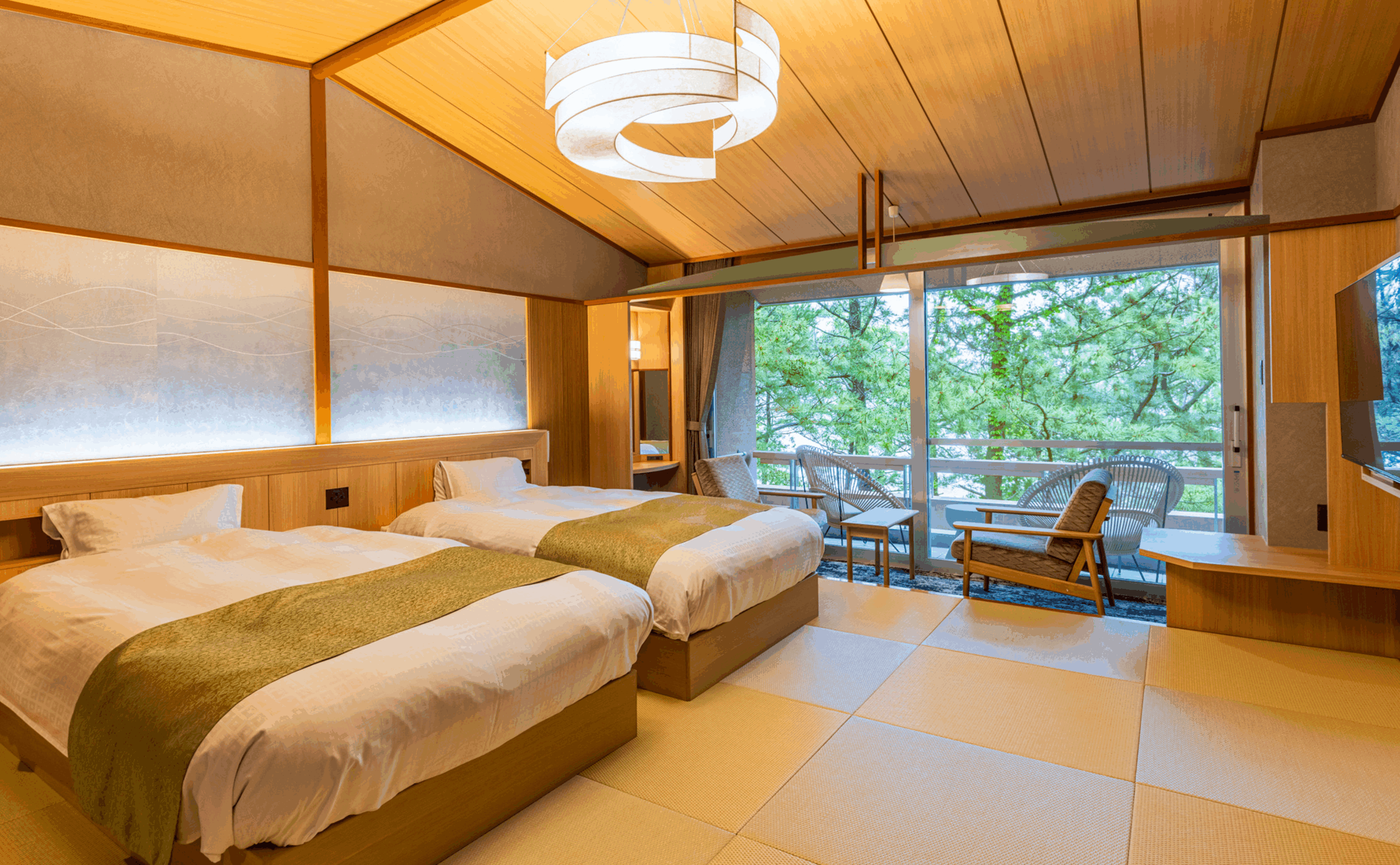 南伊豆の自然をより感じていただくようにツインベッドを大きな窓向きに配しました